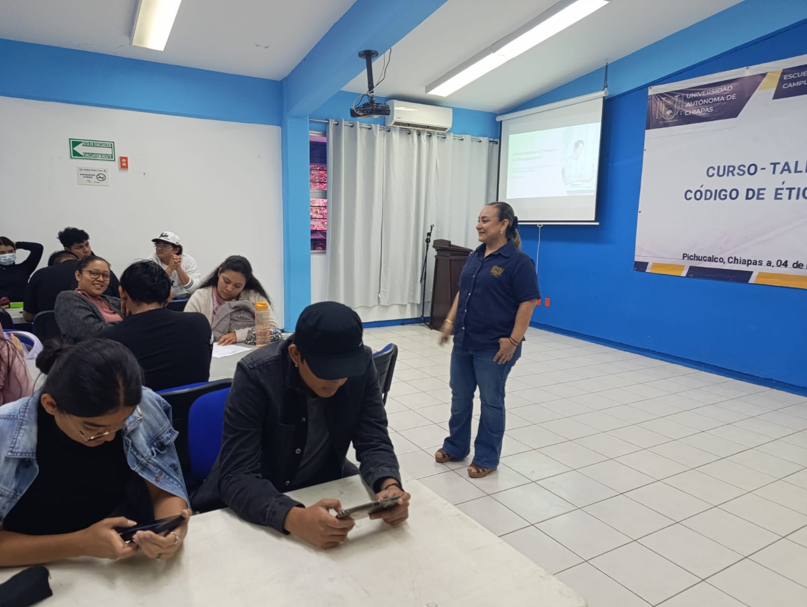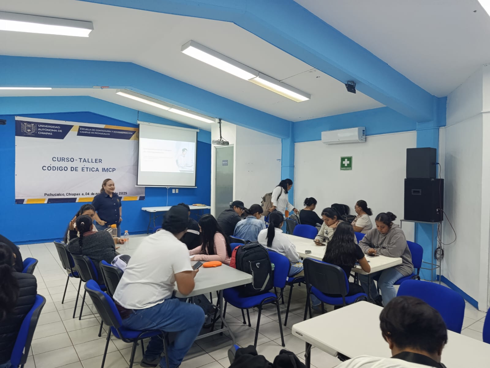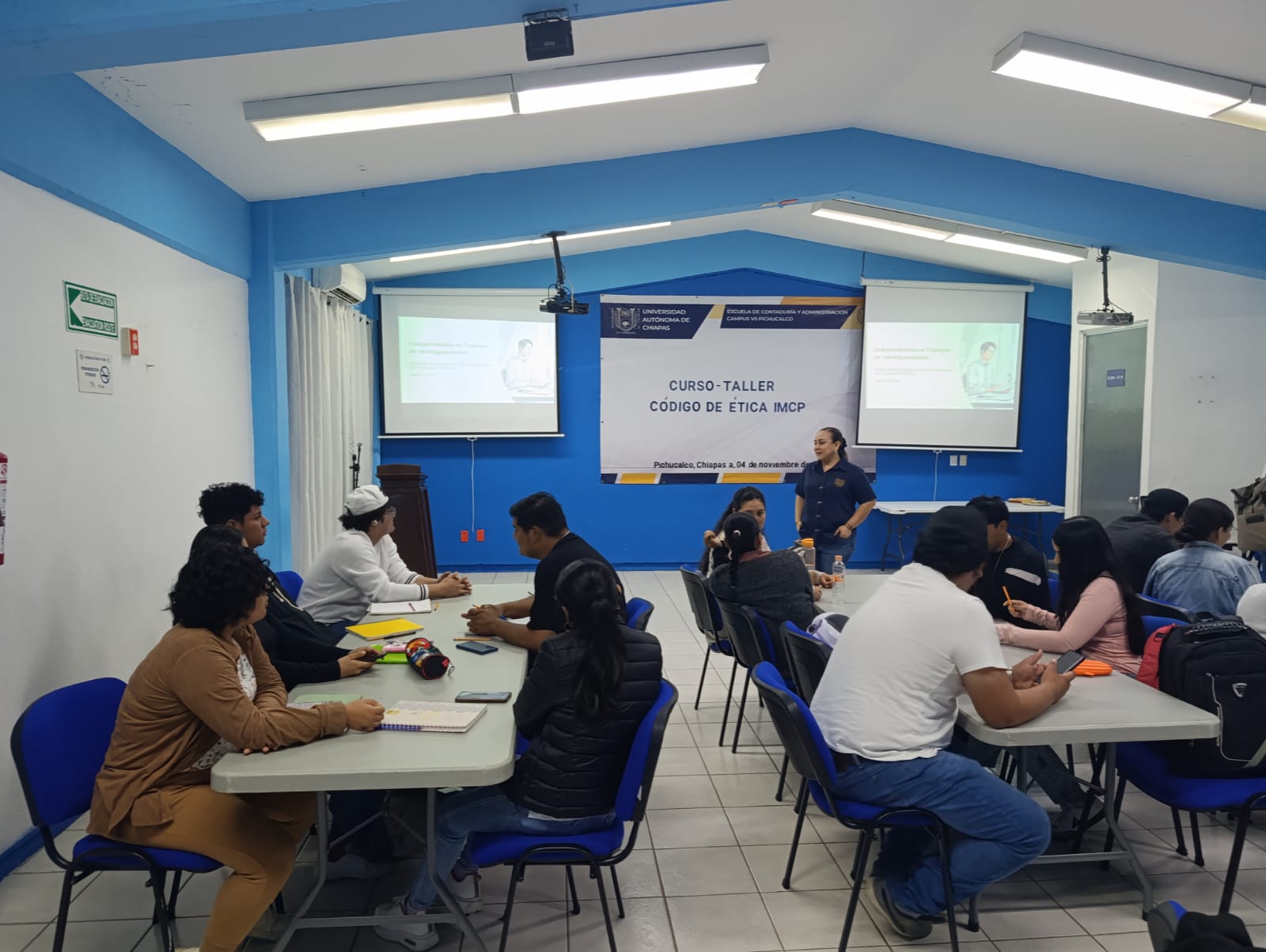 Pichucalco, Chiapas; octubre de 2025. — En seguimiento a las actividades de formación ética y profesional que promueve la Benemérita Universidad Autónoma de Chiapas (UNACH), se llevó a cabo en la Sala de Usos Múltiples de la Escuela de Contaduría y Administración, Campus VII Pichucalco, la cuarta sesión del Curso-Taller del Código de Ética Profesional del Instituto Mexicano de Contadores Públicos (IMCP).