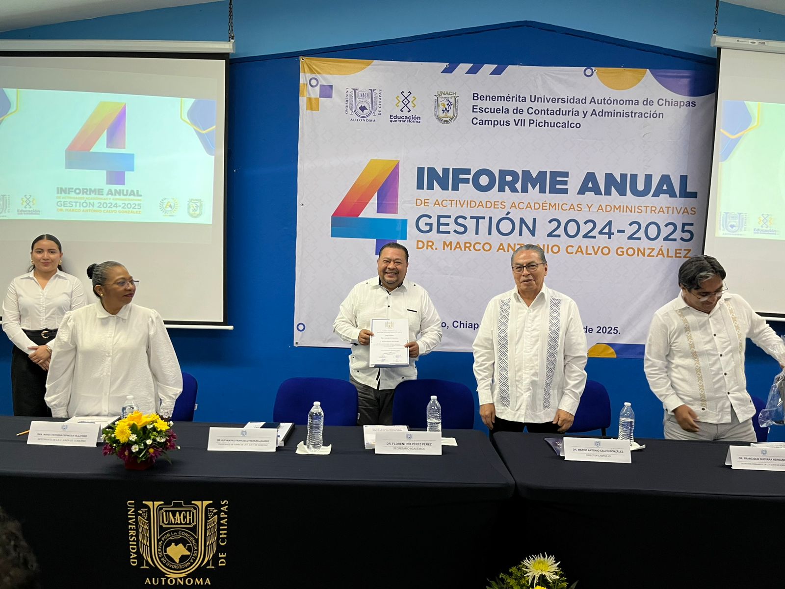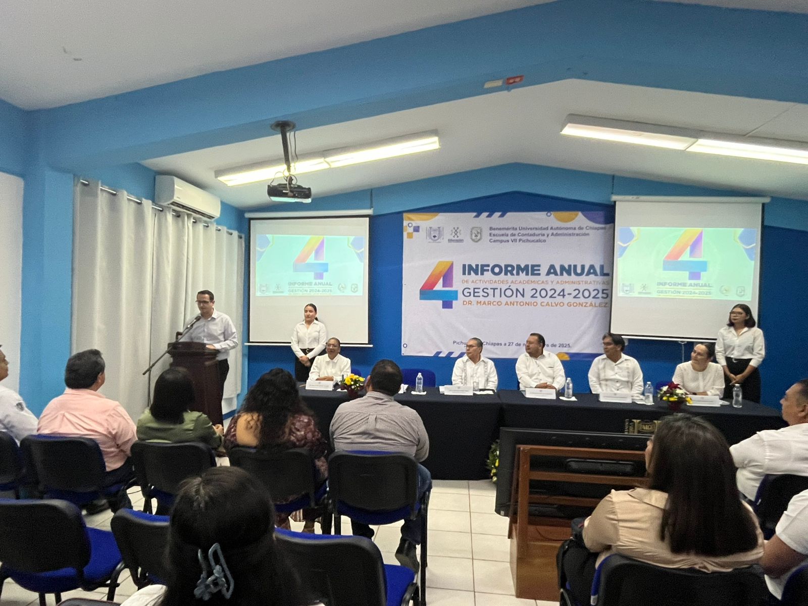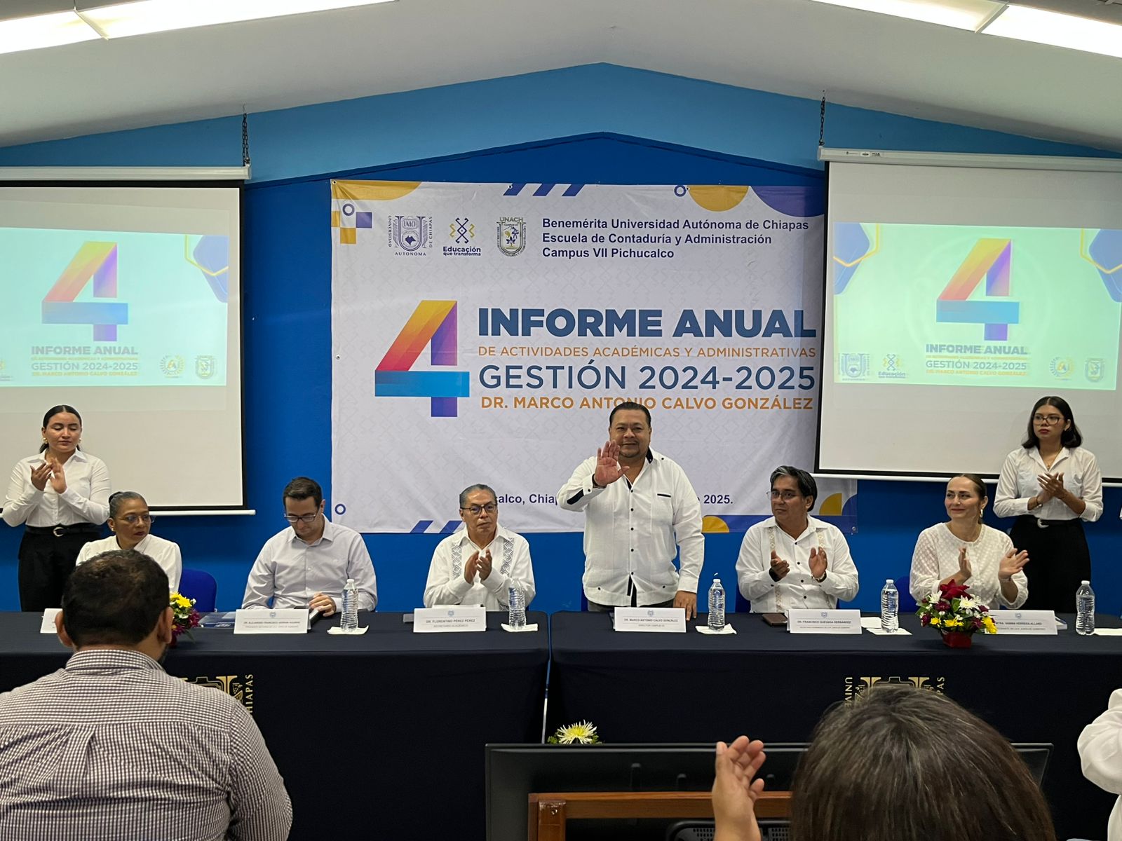 Pichucalco, Chiapas.– La Escuela de Contaduría y Administración, Campus VII Pichucalco, llevó a cabo la presentación del “4to Informe de Actividades Anual Académico-Administrativas, Gestión 2024-2025”, a cargo del Dr. Marco Antonio Calvo González, Director de la Unidad Académica, en un acto solemne que congregó a autoridades universitarias, invitados especiales, docentes, personal administrativo y la comunidad estudiantil.