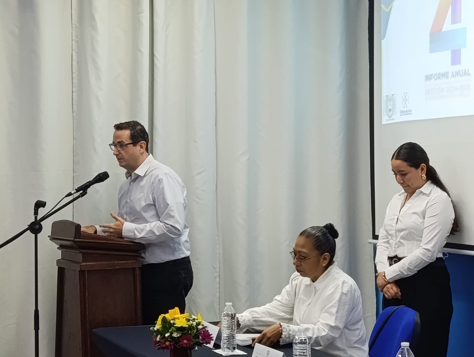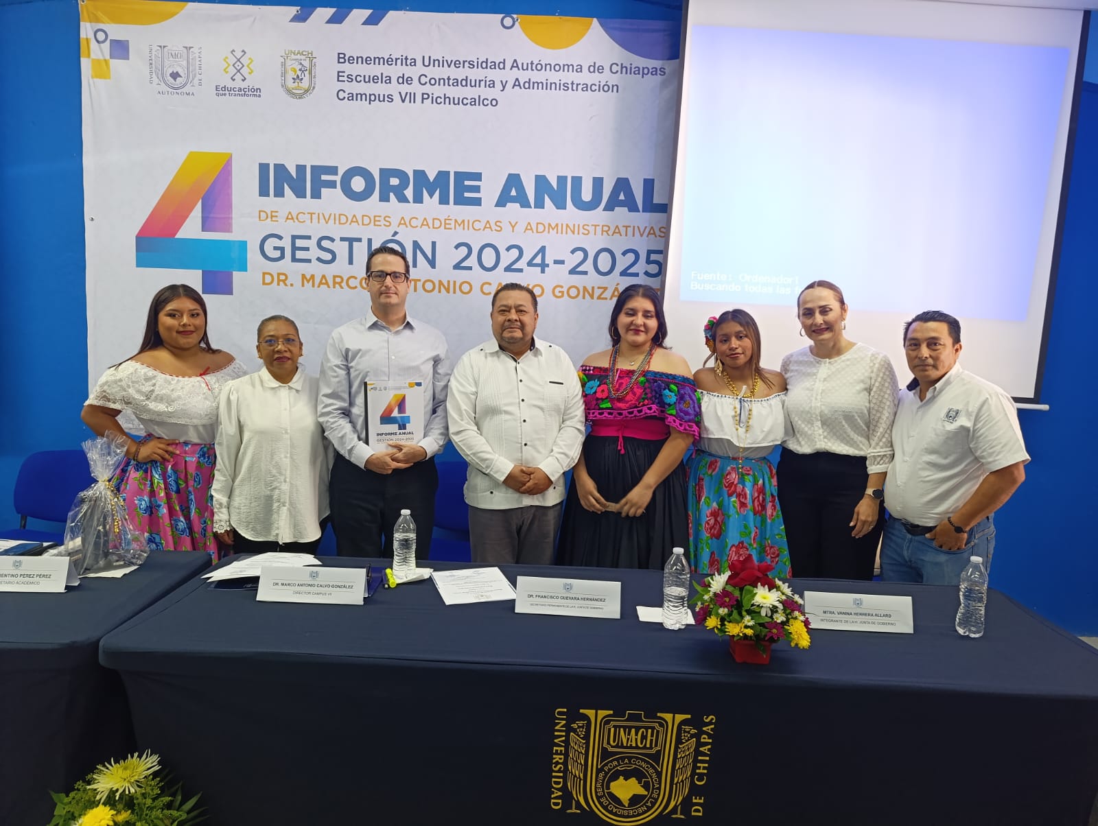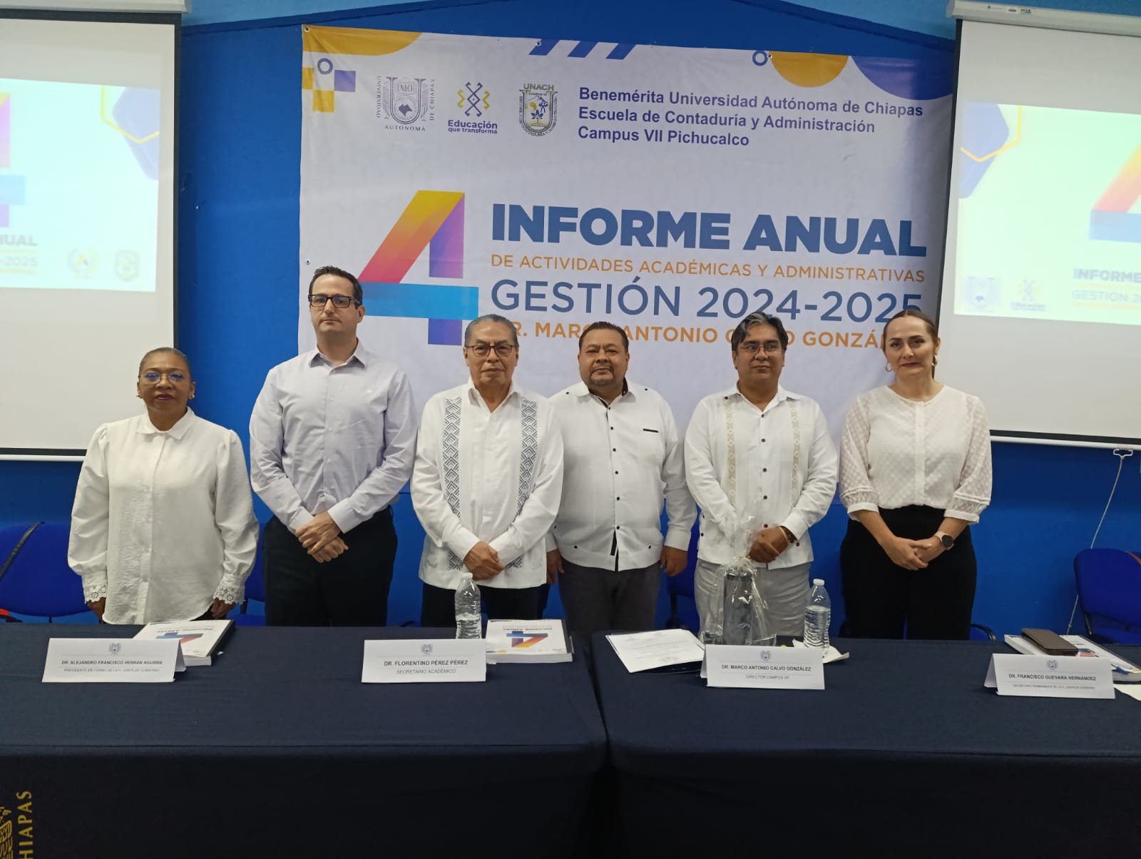 Pichucalco, Chiapas.– La Escuela de Contaduría y Administración, Campus VII Pichucalco, llevó a cabo la presentación del “4to Informe de Actividades Anual Académico-Administrativas, Gestión 2024-2025”, a cargo del Dr. Marco Antonio Calvo González, Director de la Unidad Académica, en un acto solemne que congregó a autoridades universitarias, invitados especiales, docentes, personal administrativo y la comunidad estudiantil.