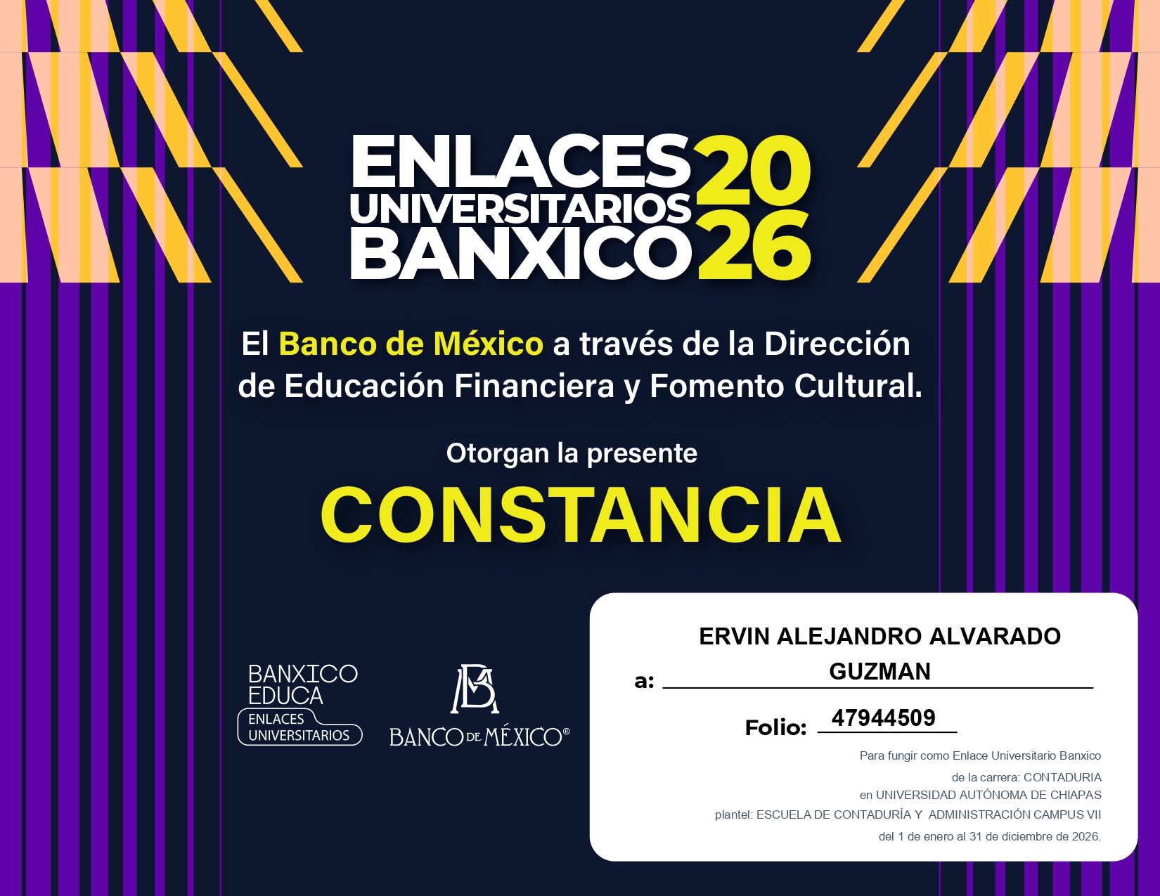 En este marco, el estudiante Ervin Alejandro Alvarado Guzmán, del séptimo semestre de la Licenciatura en Contaduría de la Escuela de Contaduría y Administración, Campus VII Pichucalco, obtuvo la Constancia Enlaces Universitarios Banxico 2026, distinción que lo acredita como Enlace Universitario del Banco de México durante el periodo correspondiente a la Generación 2026.