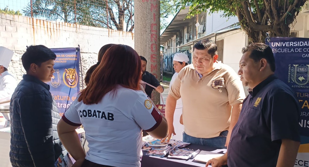 Pichucalco, Chiapas.– En el marco de la Convocatoria Febrero 2026 para el ciclo escolar agosto–diciembre 2026, y por instrucciones del Director de la Escuela de Contaduría y Administración, Campus VII, Mtro. Jorge Alberto Malpica Silva, personal académico y administrativo de esta Unidad Académica participó en la Feria Profesiográfica 2026, en su 12ª edición, realizada en las instalaciones del Plantel No. 09 del COBATAB (Colegio de Bachilleres de Tabasco), en la ciudad de Teapa, Tabasco.