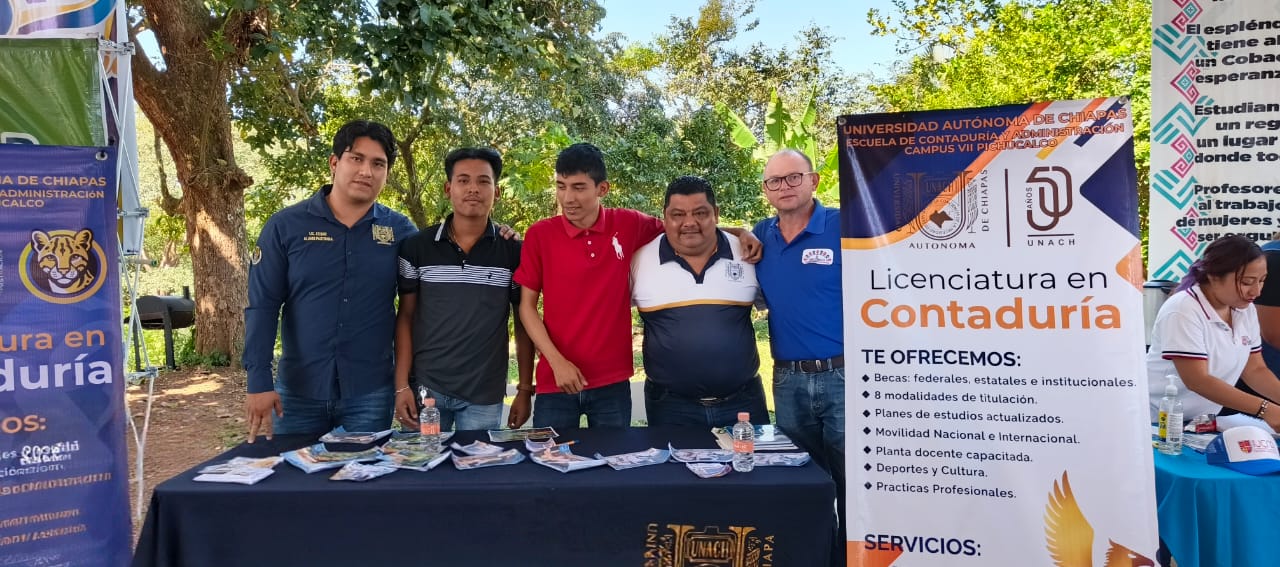 Pichucalco, Chiapas.– Por instrucciones del Director de la Escuela de Contaduría y Administración, Campus VII, Mtro. Jorge Alberto Malpica Silva, el C. César Augusto Alanís Pastrana y el L.C.P. José Ramón del Carpio Pérez, Coordinador de Extensión y Vinculación Universitaria, participaron como comisionados en la Feria Profesiográfica organizada por el Colegio de Bachilleres de Chiapas, Plantel 42 Juárez, Chiapas.