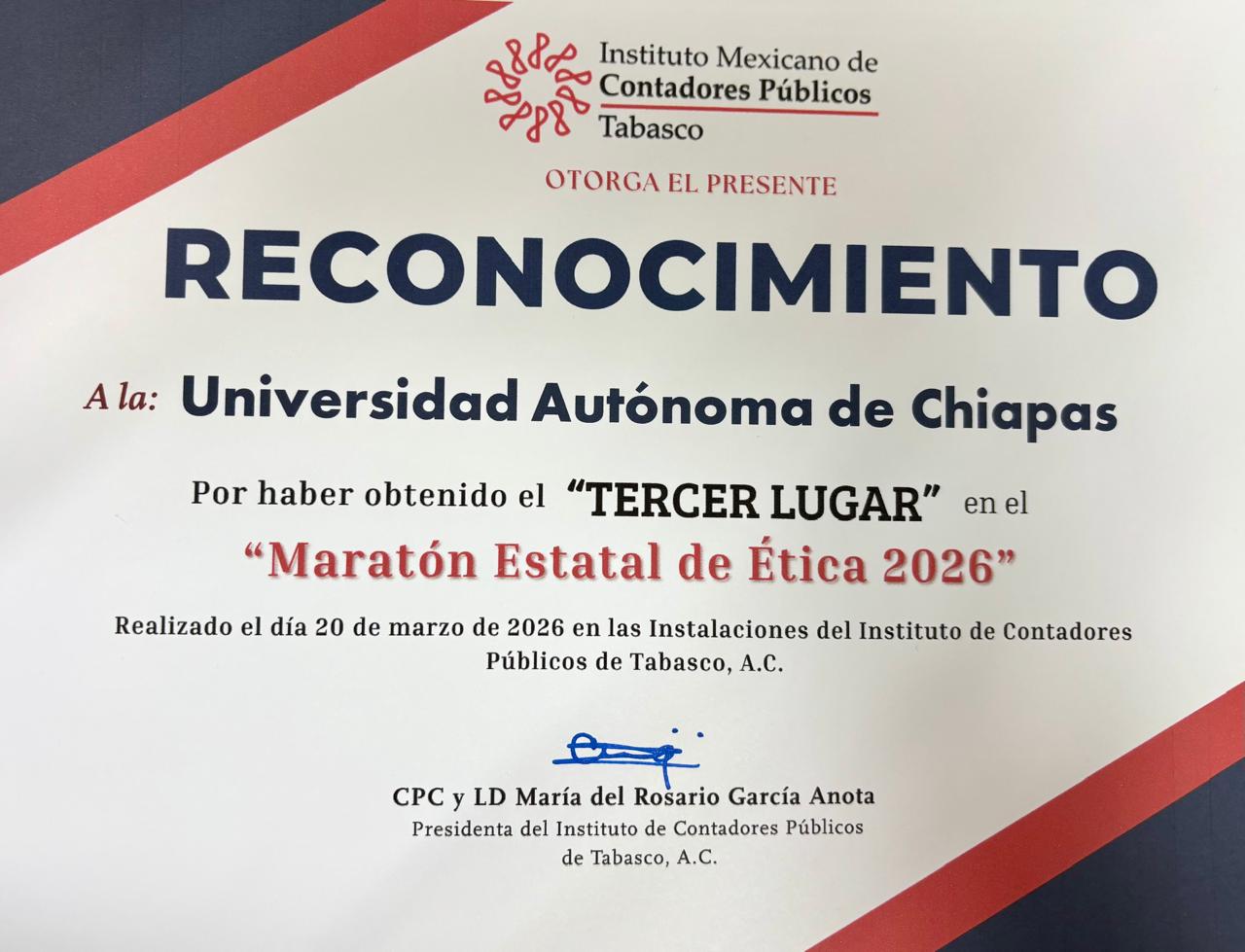Villahermosa, Tabasco. - La comunidad universitaria de la Escuela de Contaduría y Administración Campus VII de la Benemérita Universidad Autónoma de Chiapas se enorgullece en felicitar al equipo representativo de la Licenciatura en Contaduría por haber obtenido el Tercer Lugar en el Maratón Estatal de Ética 2026, evento organizado por el Instituto Mexicano de Contadores Públicos del estado de Tabasco.
