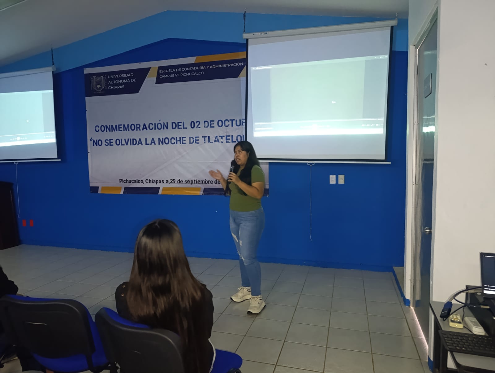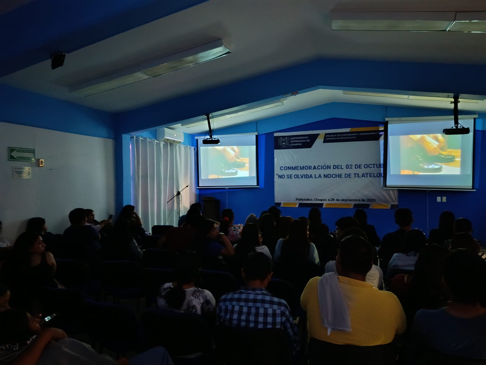 Pichucalco, Chiapas, 30 de septiembre de 2025.- En el marco del segundo día de actividades de la Semana Cultural que organiza la Escuela de Contaduría y Administración, Campus VII de la Benemérita Universidad Autónoma de Chiapas (UNACH), los estudiantes de la licenciatura en Agronegocios llevaron a cabo una jornada conmemorativa bajo el lema “2 de octubre, no se olvida: la noche de Tlatelolco”.