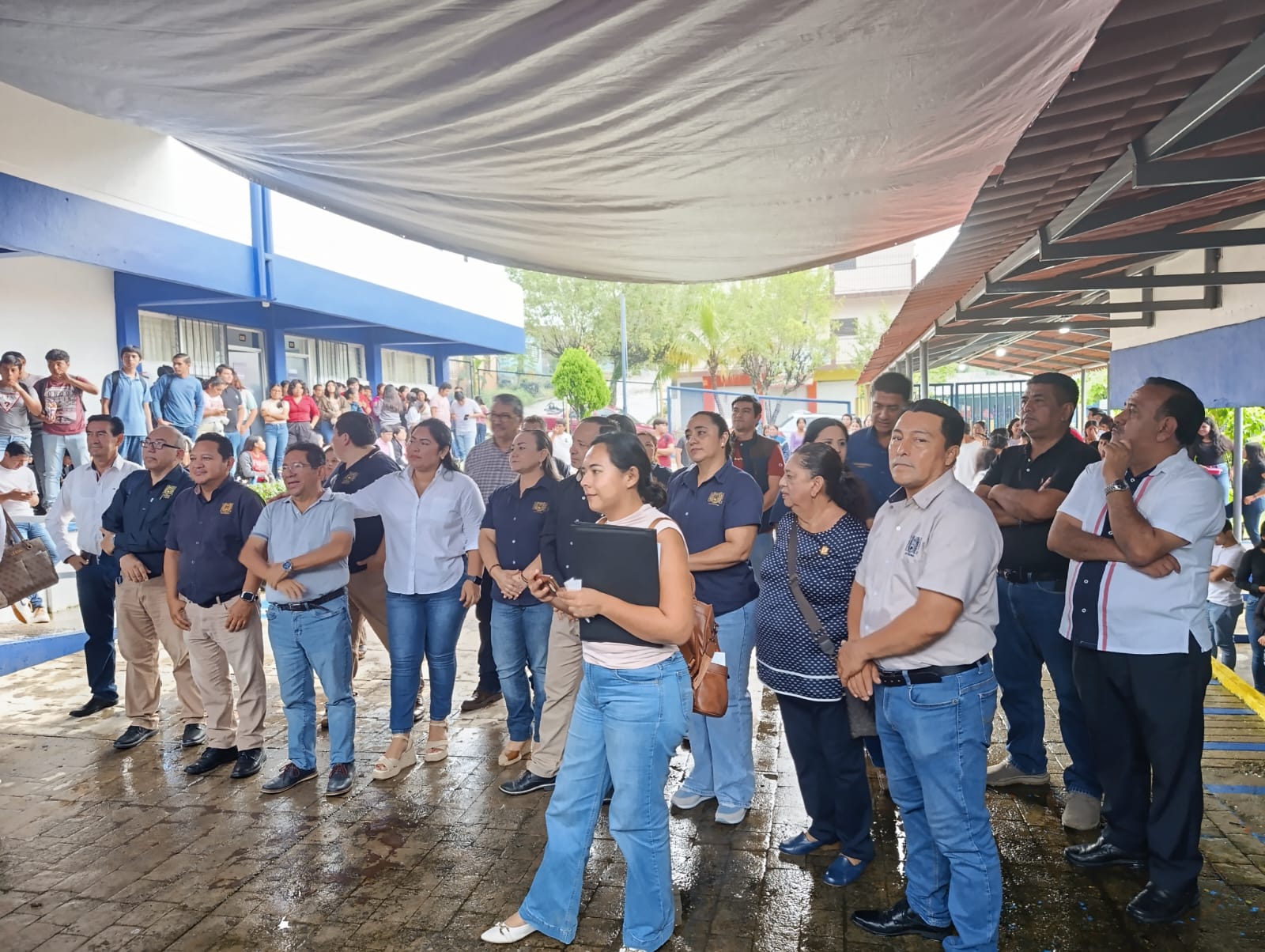 Durante el acto protocolario, realizado en la Plaza Cívica de la escuela, estuvieron presentes la Consejera Universitaria Magda Sofia Albores López, Mtra. María Cristina González Castellanos, Secretaria Académica; la Lic. Denisse Díaz Gómez, Secretaria Administrativa, y el Dr. Marco Antonio Calvo González, Director de la Escuela, quienes dieron la bienvenida a la comitiva universitaria conformada además por el Mtro. Romeo Alexander Salazar Maldonado, Director de Personal y Prestaciones Sociales, y el Mtro. Javier Guízar Ovando, representante del Programa de Alfabetización UNACH, junto con personal de ambas áreas.