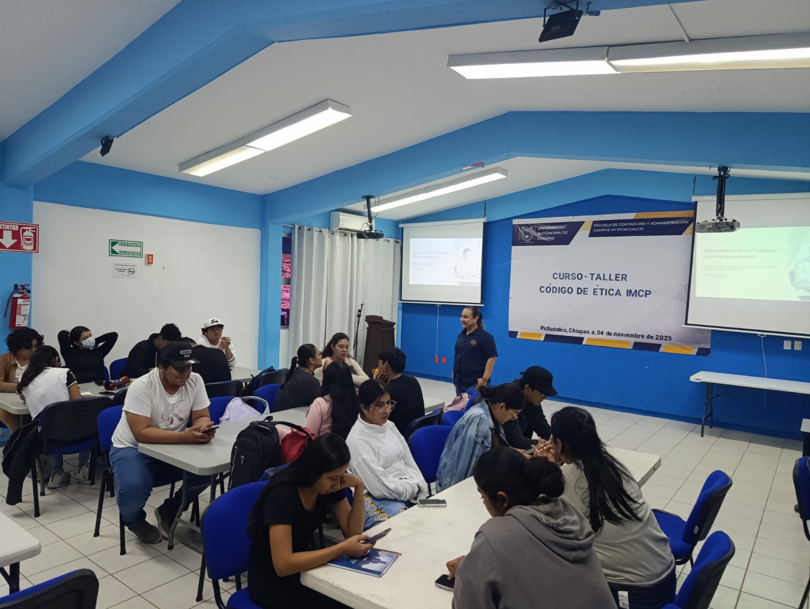 Pichucalco, Chiapas; octubre de 2025. — En seguimiento a las actividades de formación ética y profesional que promueve la Benemérita Universidad Autónoma de Chiapas (UNACH), se llevó a cabo en la Sala de Usos Múltiples de la Escuela de Contaduría y Administración, Campus VII Pichucalco, la cuarta sesión del Curso-Taller del Código de Ética Profesional del Instituto Mexicano de Contadores Públicos (IMCP).