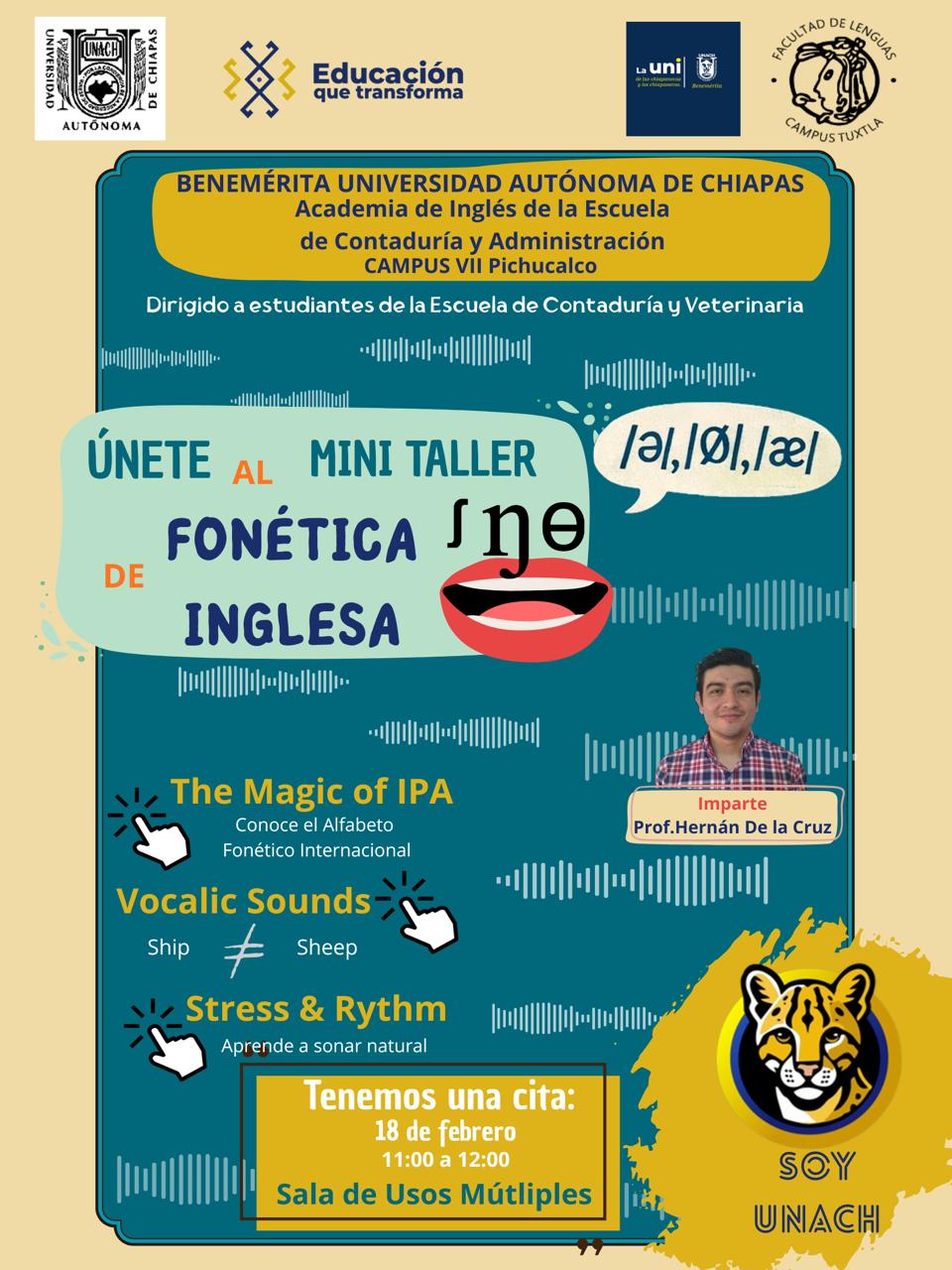 La Benemérita Universidad Autónoma de Chiapas, a través de la Academia de Inglés de la Escuela de Contaduría y Administración Campus VII Pichucalco, invita a las y los estudiantes a participar en el Mini Taller de Fonética Inglesa, donde conocerán el uso del Alfabeto Fonético Internacional (IPA) para mejorar su pronunciación y comprensión del idioma inglés.