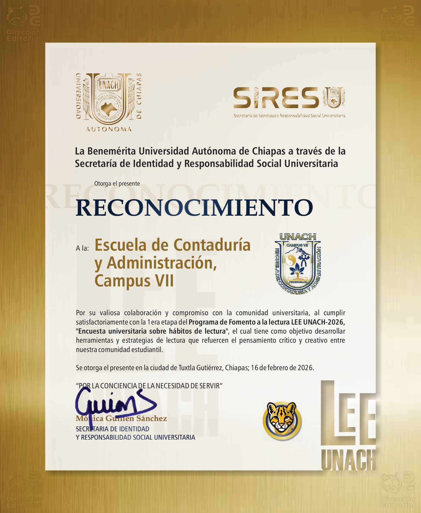 Pichucalco, Chiapas. – La Escuela de Contaduría y Administración Campus VII de la Benemérita Universidad Autónoma de Chiapas recibió un reconocimiento por su valiosa colaboración y compromiso con la comunidad universitaria, al participar activamente en la primera etapa del Programa de Fomento a la Lectura LEE UNACH 2026.