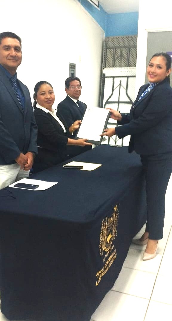 El Honorable Jurado estuvo integrado por la Dra. María Mercedes Díaz García, en calidad de Presidenta; el Mtro. Manuel Alfredo Camacho Luna, como Secretario; y el Mtro. José Trinidad Aguilar Arce, como Vocal, quienes evaluaron el desempeño académico de la pasante.