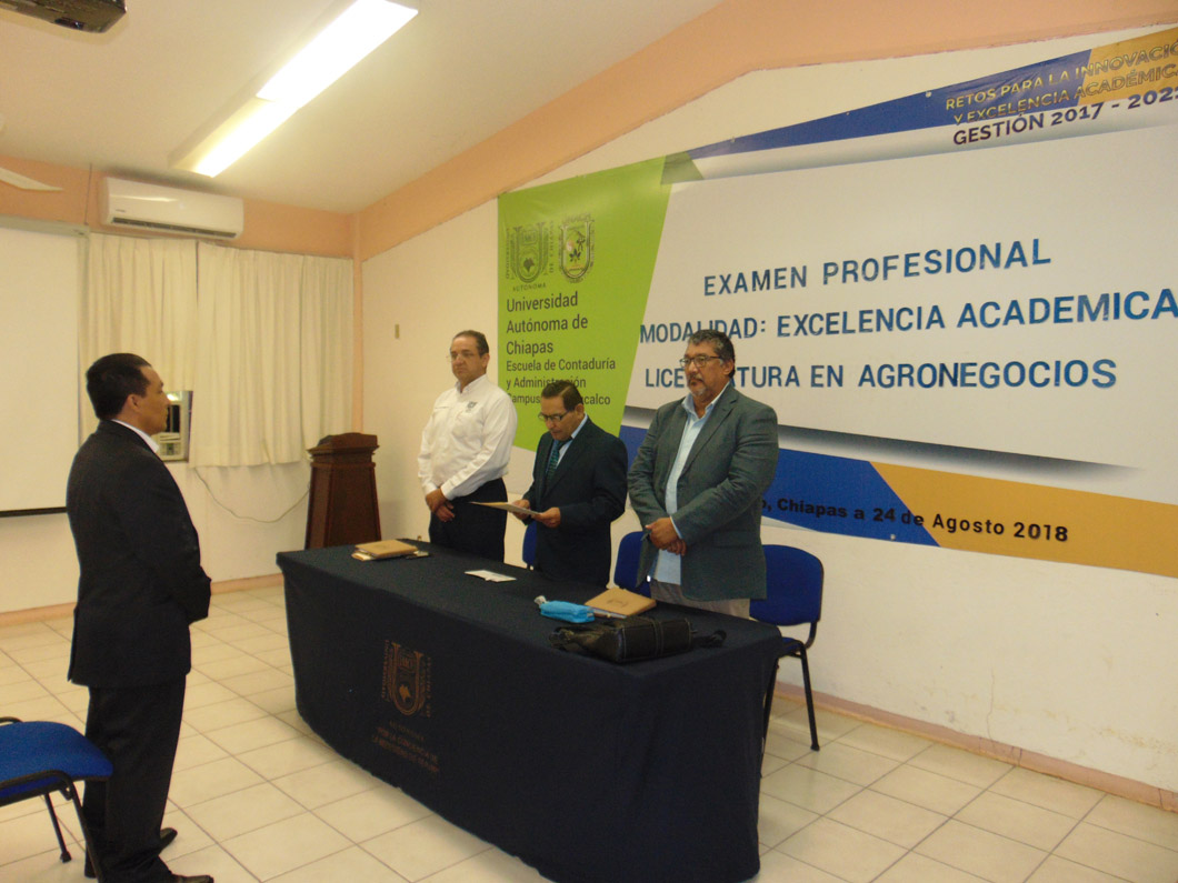 Pichucalco, Chiapas. – Se lleva a cabo en Acto Solemne en la Sala de Usos Múltiples de la Escuela de Contaduría y Administración UNACH Campus VII Pichucalco, Examen Profesional en la Modalidad de Excelencia Académica para obtener el Título de Licenciado en Agronegocios.