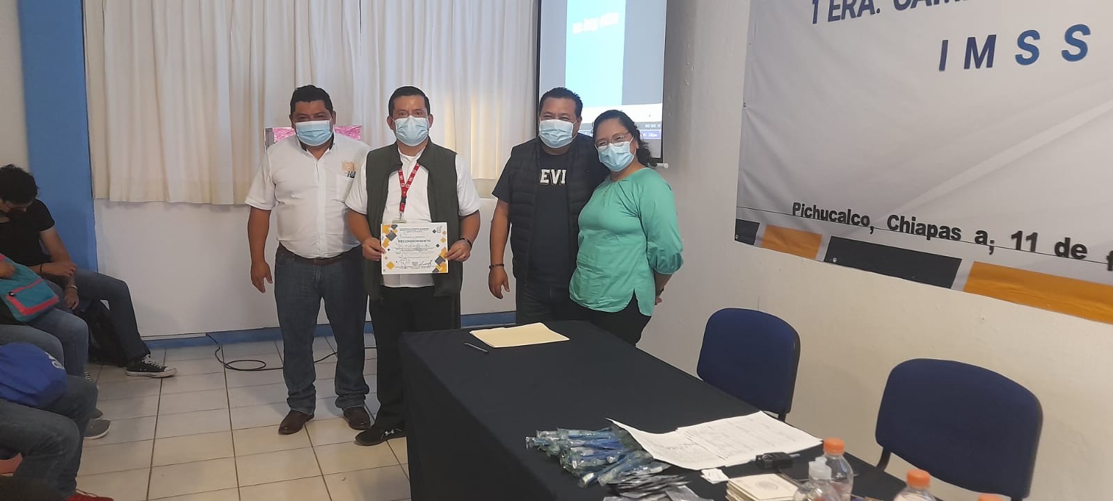Para concluir este evento, se hizo entrega de los reconocimientos correspondientes, los cuales fueron entregados por el Dr. Marco Antonio Calvo González, director de esta escuela, quien agradeció la participación del Personal de IMSS y de la Coordinación de Extensión Universitaria, comprometidos siempre con la salud de los estudiantes. Además, estuvieron presentes ella Lic. Ana Lilia Velasco Bastard Encargada del Departamento de Culturales, la Lic. Heidy Guadalupe Arias Cruz Encargada del Departamento de Seguro Facultativo y el L.C.P. José Ramón del Carpio Pérez Coordinador de Extensión Universitaria.