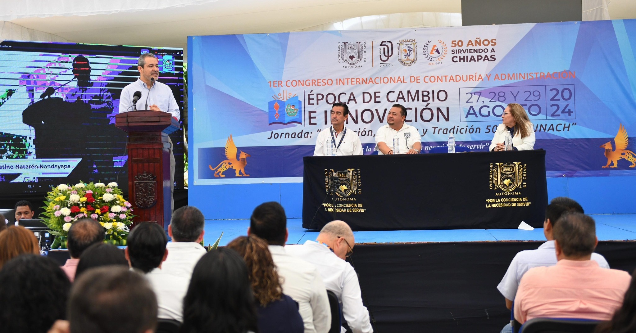 Durante la ceremonia de inauguración, el rector de la UNACH, Dr. Carlos Faustino Natarén Nandayapa, enfatizó la importancia de estos encuentros académicos para dotar a los estudiantes de los conocimientos más recientes y las innovaciones en el campo de la contaduría y la administración. Subrayó que el objetivo principal del congreso es proporcionar a los futuros profesionales las herramientas necesarias para enfrentar los desafíos actuales en un entorno global en constante cambio.
