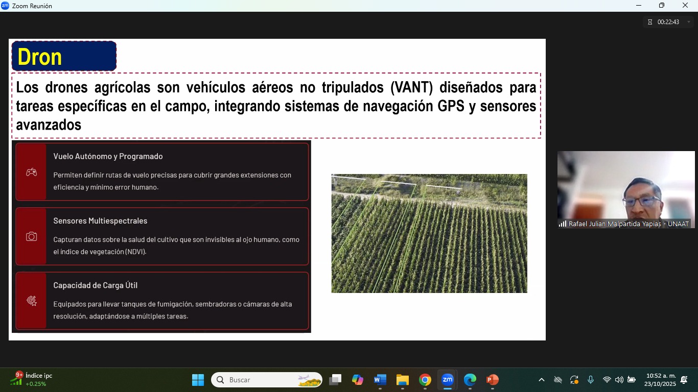 Posteriormente, se realizó la Segunda Conferencia Internacional titulada “Drones e inteligencia artificial: herramientas eficientes para una agricultura sostenible”, presentada por el Dr. Rafael Julián Malpartida Yapias (Perú) en modalidad virtual vía Zoom, cuya constancia fue entregada por la Mtra. María Cristina González Castellanos, Secretaria Académica del Campus VII.
